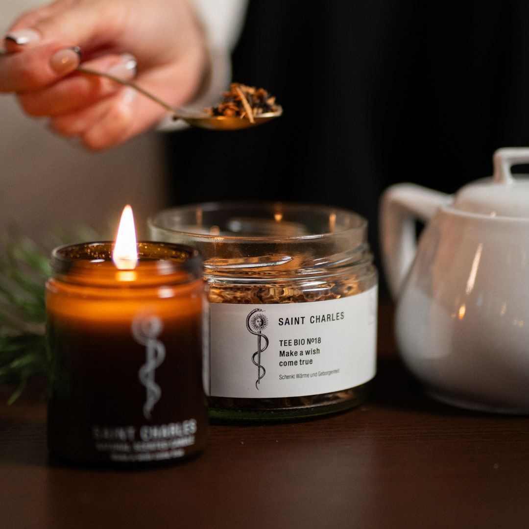 Das Make a Wish Set vereint Duft und Geschmack zu einem stimmungsvollen Ritual für den Winter. Mit der handgegossenen Duftkerze „Make a wish come true“ und dem passenden Wintertee mit Schwarztee, Kardamom und Zimt lädt dieses Set dazu ein, den Moment zu genießen – allein oder gemeinsam.