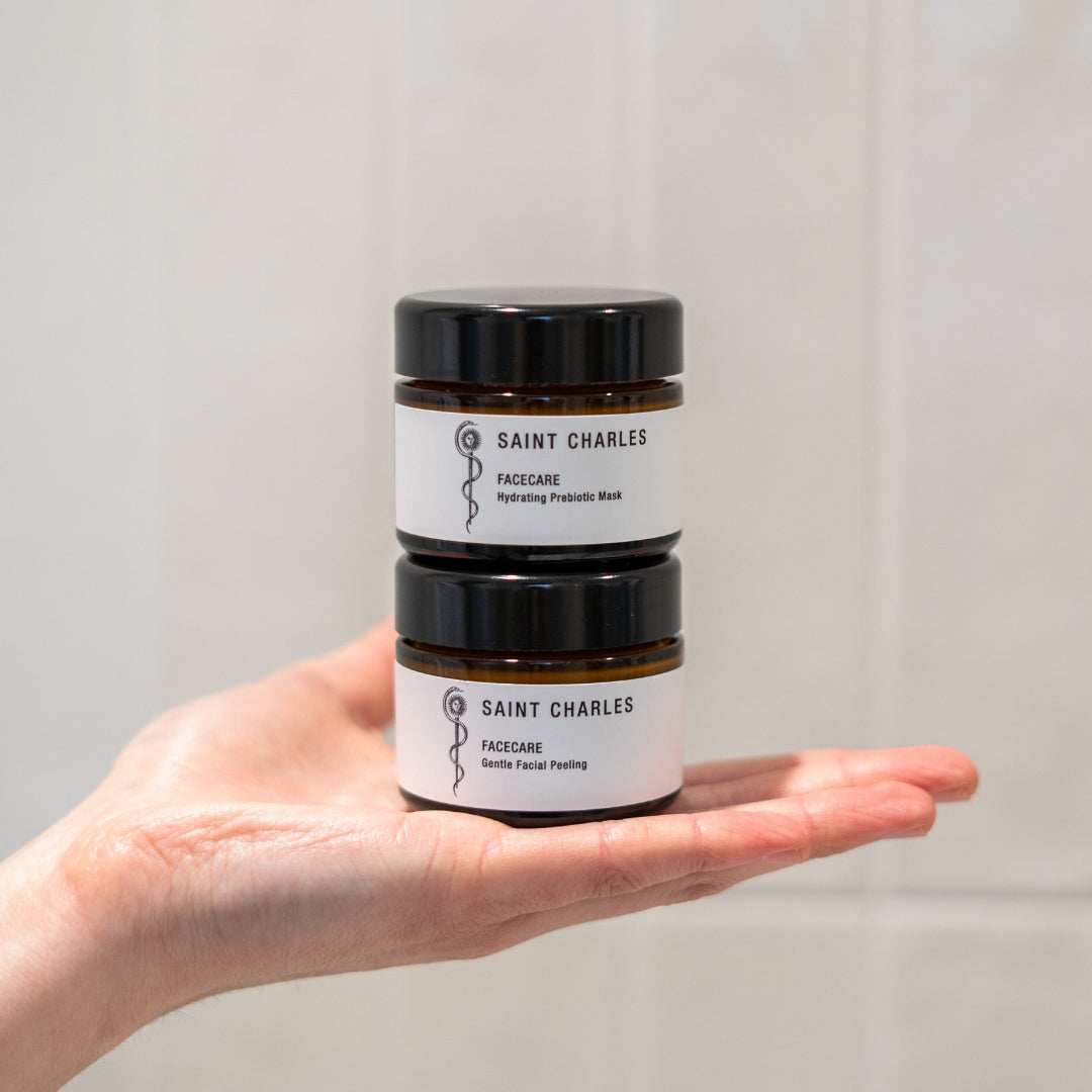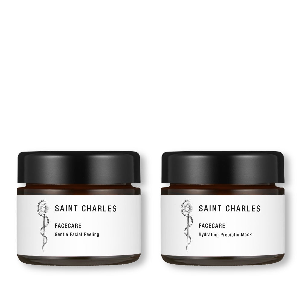 1–2 Mal pro Woche anwenden: Zuerst das Gentle Facial Peeling auf die feuchte Haut auftragen und in sanften, kreisenden Bewegungen einmassieren. Anschließend gründlich abspülen. Danach die Hydrating Prebiotic Mask auf Gesicht und Dekolleté auftragen, 5–10 Minuten einwirken lassen und ebenfalls abspülen.