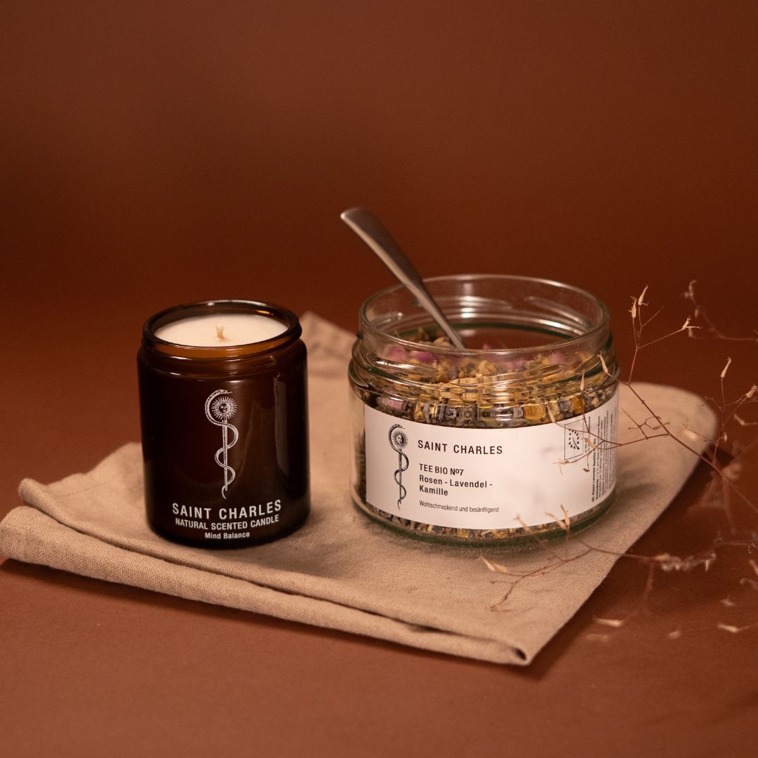 - Eine handgegossene Mind Balance Kerze, den Rosen-Lavendel-Kamille Tee, eine Ritualkarte mit Inspiration zur Anwendung – alles liebevoll verpackt in der Saint Charles Geschenktüte.