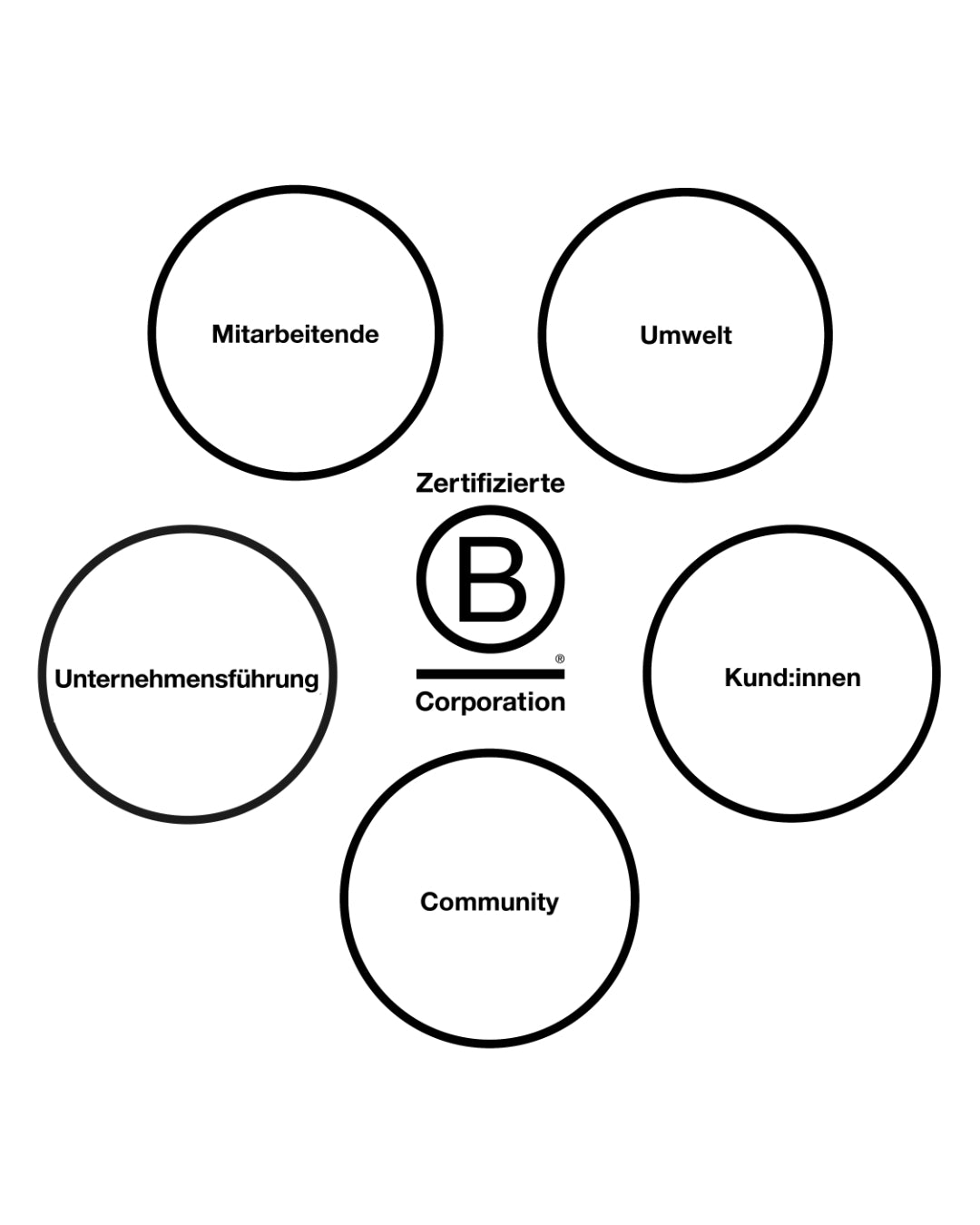 Der Name "B Corp" steht für "Benefit for all" und "Corporation". Das bedeutet, dass wir uns als Unternehmen einen Mehrwert für Gesellschaft und Umwelt leisten möchten.